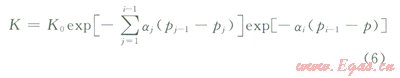 在Pi≤P≤i-1內(nèi)(其對應(yīng)的徑向距離ri≤r≤ri-1),儲層滲透率可以表示為: