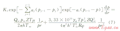 P0為原始地層壓力,MPa;p為目前地層壓力,MPa;K0為原始滲透率,mD;K為目前滲透率,mD;a為滲透率模量,Mpa-1;r為平面徑向距離,m;m為黏度,mPa·s;u為氣體在地層中的滲流速度,m/s;b為湍流系數(shù),m-1;r為地層氣體密度,kg/m3;Qsc為地面標準狀態(tài)下的產(chǎn)量,m3/d;psc為標準大氣壓,Mpa;Z為氣體偏差,無因次;T為地層溫度,K;h為儲層百度,m;Tsc為標準狀態(tài)下溫度,K;gg為地層氣體的相對密度,無因次;R為通用氣體常數(shù),Mpa·m3/(kmol·K);j為孔隙度,無因次。