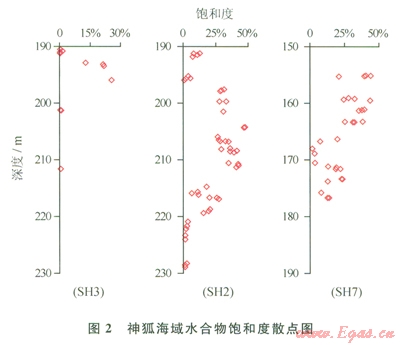 圖2是神狐海域SH3、SH2和SH7站位現(xiàn)場測試的水合物飽和度散點圖。SH3站位含水合物層較薄,水合物集中分布在192~196m段,最高飽和度值出現(xiàn)在196m處,飽和度值為25.5%,與聲波曲線高值段相對應,含水合物層的最高聲速值為205lm/s。SH2站位含水合物層大約有30m厚,水合物集中分布在海底l90~220m,該站位水合物飽和度相對較高,超過l5%高飽和度水合物主要集中在197~220m段,飽和度值為15%~47%,平均為29%。該深度段的聲波速度值相對較高,含水合物層的最高聲速為2279m/s。SH 7站位水合物層大約有22m厚,水合物集中分布在海底l55~177m。與SH2站位相似,該站位水合物飽和度較高,水合物的分布主要分為2段,l55~164m為高飽和度值段,水合物的飽和度為25%~44%,平均為34%,該深度段的聲波速度值整體較高,最高聲速為2578m/s;而l66~177m深度段的水合物飽和度相對較低,飽和度值為3%~23%,平均為l4%,該深度段的聲波速度值有下降的趨勢,最高聲速為2256m/s。
