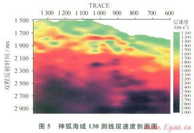 圖5為神狐海域l30測線用Dix公式計算的層速度剖面。在距海底大約250ms上方附近(地震剖面上解釋為BSR位置),明顯顯示出一段近似平行于海底的相對高速層,高速層上、下都是明顯的低速層。高速層的層速度在1800~2500m/s,其上面低速層的層涑度為1500~1700m/s,而下面的低速層的層速度在l100~l500m/s,有明顯的游離氣存在的低速特征,可以認為該測線的相對高速層速度是水合物層的反映。