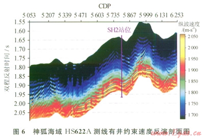 圖6是神狐海域HS622A測線速度反演剖面。距海底大約200ms的沉積層中有一與海底平行高速帶,厚度約為25m,速度值在2050m/s左右,是沉積層中有水合物存在的體現(xiàn)。高速之下有一速度值約為1800m/s的低速帶,是水合物層之下存在游離氣層的緣故。與層速度剖面相比,有井約束速度反演剖面具有更高的分辨率,能更準確地判定水合物的富集層位,礦體厚度和游離氣的分布情況,對水合物的速度精細解釋起到關(guān)鍵的作用。