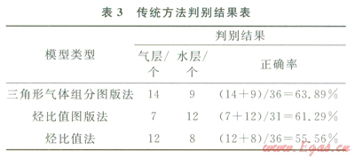 通過上述分析,可以把三角形氣體組分圖版法、烴比值圖版法和烴比值法的判別指標參數(shù)作為變量元,以文中所給的氣測樣本數(shù)據(jù)集作為樣本空間,構(gòu)建多元線性分析模型。在此基礎(chǔ)上進行判別模型識別效果比較。表3是3種傳統(tǒng)方法的判別效果。