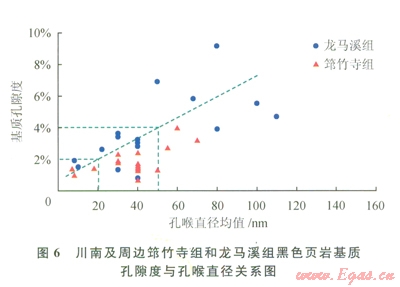 筇竹寺組頁巖樣品孔喉直徑均值一般介于7~105nm,樣品孔喉直徑分布頻率為低于20nm的樣品占9.1%,20~50nm的樣品占69.7%,50~80nm的樣品占12.1%,80~110nm的樣品占9.1%,即直徑小于50nm的中小孔隙占78.8%,直徑大于50nm的大孔隙僅占21.2%。龍馬溪組頁巖孔喉直徑均值一般介于8~160nm,樣品孔喉直徑分布頻率為低于20nm的樣品占5.1%,20~50nm的樣品占51.3%,50~80nm的樣品占l7.9%,80~110nm的樣品占20.5%,大于ll0nm的樣品占5.1%,即直徑小于50nm的中小孔隙占56.4%,直徑大于50nm的大孔隙占43.6%(為筇竹寺組的2倍)。兩套海相頁巖基質(zhì)孔隙度與孔喉直徑均值都具有較好的正相關(guān)性(圖6),孔喉直徑均值為50nm以上、20~50nm和20nm以下的樣品分別具有2.7%~6.9%(平均為4.9%)、0.7%~3.6%(平均為2.1%)和1.0%~l.9%(平均為1.4%)的基質(zhì)孔隙度。這表明,要形成孔隙度在2%以上的有效頁巖儲層,孔喉直徑均值一般需要超過20nm;要形成孔隙度超過4%的優(yōu)質(zhì)頁巖儲層,孔喉直徑均值需達到50nm以上??梢姡陧搸r納米級孔隙系統(tǒng)中,對基質(zhì)孔隙度貢獻最突出的是孔徑超過50nm的大孔隙,其次是孔徑介于20~50nm的中孔,而貢獻最小的是孔徑低于20nm的微小孔(對應(yīng)的孔隙度一般低于2%);筇竹寺組頁巖以孔徑低于50nm的中小型孔隙為主,而孔徑超過50nm的大孔隙明最少于龍馬溪組,這是導(dǎo)致該頁巖基質(zhì)孔隙度明顯減少并低于龍馬溪組的重要原因之一。