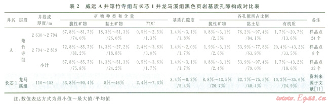 3)黑色頁巖段孔隙度較小的原因主要表現(xiàn)為兩方面:①該頁巖熱成熟度過高,有機質(zhì)叮能出現(xiàn)碳化,導(dǎo)致有機質(zhì)孔隙出現(xiàn)部分塌陷和充填;②該頁巖成巖作用強,導(dǎo)致大孔隙減少,巖石更加致密。