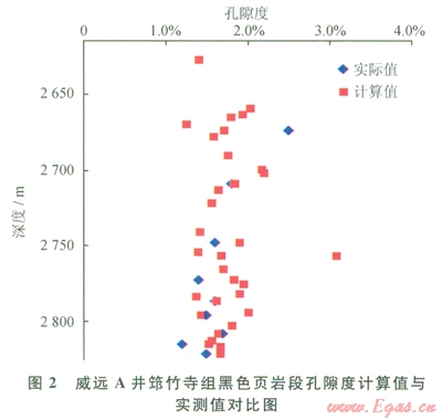 根據(jù)VBri、VClay、VTOC的計算結(jié)果,結(jié)合巖石礦物測試數(shù)據(jù),筆者對威遠A井2630~2819m頁巖段的32個深度點(對應(yīng)的TOC為0.5%~3.6%)進行了孔隙度測算,并將計算孔隙度與該深度段的實測孔隙度進行對比(圖2)。對比結(jié)果表明,上述32個深度點的計算孔隙度與該井段實測孔隙度吻合,從而證實所選擇的3個刻度點以及VBri、VClay、VTOC計算值符合筇竹寺組頁巖儲集空間的實際地質(zhì)狀況,可以作為分析筇竹寺組孔隙構(gòu)成的有效方法和地質(zhì)依據(jù)。