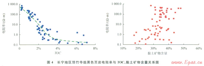根據(jù)頁巖三層巖石物理模型[11],筇竹寺組、龍馬溪組等海相頁巖由脆性礦物、黏土層和有機質(zhì)等導(dǎo)電性差異極大的3類物質(zhì)組成。脆性礦物層由石英、長石、方解石、白云石、黃鐵礦等物質(zhì)組成,孔隙極少,一般認為只有黃鐵礦具有導(dǎo)電性,但黃鐵礦因質(zhì)量百分含量一般低于l0%且主要呈星點狀分布,因此對頁巖的導(dǎo)電性貢獻不大。黏土礦物主要由蒙脫石、伊蒙混層、伊利石、綠泥石等具有附加導(dǎo)電性的物質(zhì)組成,是形成碎屑巖低阻油氣層的主要介質(zhì)之一[23]。有機質(zhì)層一般不導(dǎo)電,但在極高成熟 變生階段因出現(xiàn)碳化現(xiàn)象則具有較強的導(dǎo)電性。根據(jù)Barnett頁巖和我國東西部低阻油氣層電性特征,細粒碎屑巖的導(dǎo)電性主要為泥質(zhì)/黏土礦物所控制,處于有效生烴窗內(nèi)的有機質(zhì)和烴類泥頁巖一般不導(dǎo)電。因此黑色頁巖電阻率一般隨著泥質(zhì)/黏土礦物增加而降低,隨有機質(zhì)豐度增加而升高[10,12,23],例如:渤海灣地區(qū)古近系一新近系砂泥巖低阻油氣層一般含有20%~65%黏土礦物,其電阻率大多為5~20W·m,且隨著黏土礦物含量增加而降低[23];川南龍馬溪組頁巖電阻率一般為8~40W·m,且總體隨著有機質(zhì)豐度增加而升高[10]。