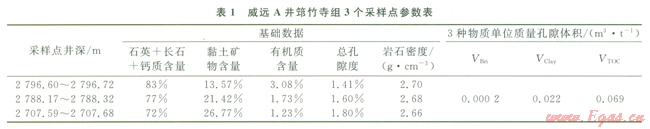 筆者在威遠A井2796.60~2796.72 m、2788.17~2788.32m和2707.59~2707.68m挑選3個黑色頁巖樣品(對應(yīng)的TOC分別為3.08%、l.73%、1.23%),對孔隙度數(shù)學(xué)模型進行刻度(表1)。首先,根據(jù)3個深度點的巖礦、TOC和孔隙度等測試資料和孔隙度計算模型建立三元一次方程組,然后解方程組計算獲得VBri、VClay、VTOC這3個關(guān)鍵參數(shù)值。經(jīng)過計算,筇竹寺組黑色頁巖VBri、VClay、VTOC值分別為0.O002m3/t、0.022m3/t、0.069m3/t(表1)。這表明,筇竹寺組頁巖3種物質(zhì)單位質(zhì)量所產(chǎn)生的孔隙體積為有機質(zhì)最大、黏土礦物次之、脆性礦物最小。