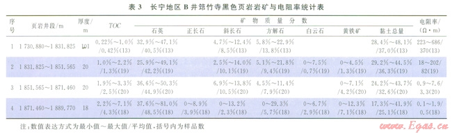 筆者依據(jù)長寧地區(qū)B井筇竹寺組黑色頁巖的巖礦、地化和測井響應(yīng)資料,建立了中下部4段合計厚度159m頁巖的電阻率與TOC、黏土礦物的關(guān)系圖表(圖4、表3),以了解哪種物質(zhì)是控制頁巖導(dǎo)電性的主要介質(zhì)。此項研究的結(jié)果顯示,筇竹寺組黑色頁巖電阻率與黏土礦物含量無明顯相關(guān)性,但與TOC呈良好的負相關(guān)性,具體描述如下:①1730.88~1831.825m井段,厚度l01m,黏土礦物含量為28.4%~48.1%,TOC不足l%(平均0.42%),有機質(zhì)總體較少,頁巖電阻率值一般為220~686W·m,顯然是黏土礦物的導(dǎo)電性在發(fā)揮主導(dǎo)作用,并且呈現(xiàn)高阻特征;②l831.825~1851.565m井段,厚度20m,黏土礦物含量保持穩(wěn)定(29.2%~44.5%),而有機質(zhì)含量開始增加,TOC一般介于1.0%~2.2%(平均為1.3%),頁巖電阻率則下降至18~202W·m(多為l0~100W·m),頁巖電性出現(xiàn)由高阻向低阻過渡特征,這表明有機質(zhì)導(dǎo)電性開始顯現(xiàn),其電阻率較黏土礦物低;③1851.565~1871.46m,厚度20m,黏土含量略有下降(一般為24.2%~43.7%),有機質(zhì)含量增至l.9%~3.3%,頁巖電阻率則快速下降至0.9~7.6W·m,表現(xiàn)為明顯的低阻特征,這說明有機質(zhì)具有較低電阻率,并且開始主導(dǎo)頁巖地層的導(dǎo)電性;④l871.46~1889.77m,厚度18m,黏土礦物含量下降至l8%~40%(平均為25.1%),有機質(zhì)含量增加至2.2%~7.1%(平均為4.3%),頁巖電阻率則下降至0.1~1W·m,大大低于龍馬溪組頁巖和渤海灣地區(qū)低阻砂泥巖的電阻率,呈現(xiàn)超低電阻特征,這進一步證實筇竹寺組頁巖有機質(zhì)具有較強的導(dǎo)電性(圖4、表3)。由此推測,川南筇竹寺組頁巖中的有機質(zhì)可能出現(xiàn)了明顯的碳化現(xiàn)象,因而具有比黏土礦物更強的導(dǎo)電性,進而導(dǎo)致富有機質(zhì)頁巖段(TOC>2%)具有低一超低電阻特征。