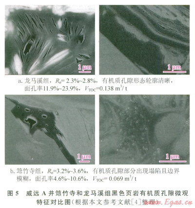 碳化不僅導(dǎo)致有機質(zhì)產(chǎn)氣能力降低,微觀結(jié)構(gòu)改變,導(dǎo)電性變強,而且對有機質(zhì)孔隙發(fā)育也會產(chǎn)生影響。鄒才能、董大忠、李新景等通過對威遠地區(qū)筇竹寺組(R。介于3.2%~3.6%)和龍馬溪組(R。介于2.3%~2.8%)頁巖樣品開展高倍電鏡(氬離子拋光處理后)觀察發(fā)現(xiàn),在相近尺度(比例尺刻度值為1mm)的電鏡資料中,筇竹寺組頁巖有機質(zhì)孔隙發(fā)育程度較龍馬溪組頁巖差(圖5),主要表現(xiàn)為:受有機質(zhì)碳化影響,筇竹寺組有機質(zhì)孔隙出現(xiàn)明顯的塌陷和充填現(xiàn)象,邊界模糊不清或呈弧形,孔徑變小,其中大量直徑小于40nm的孔隙因完全充填而基本消失(圖5-b右),進而導(dǎo)致有機質(zhì)內(nèi)微孔隙體積大幅度減少,測試面孔率僅4.6%~l0.6%(圖5-b);相反,龍馬溪組頁巖有機質(zhì)孔隙不僅數(shù)量多,且形態(tài)輪廓清晰(多呈菱形或多邊形),較少出現(xiàn)充填現(xiàn)象,測試面孔率為ll.9%~23.9%(圖5-a)。鏡下分析表明,受有機質(zhì)碳化影響,筇竹寺組頁巖有機質(zhì)產(chǎn)生的微孔隙體積明顯比龍馬溪組少,這與前面的計算結(jié)果(筇竹寺組的VTOC僅為龍馬溪組的1/2)相吻合。