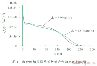 導(dǎo)熱系數(shù)是指水合物儲(chǔ)層傳播熱量的能力。水合物分解是一個(gè)吸熱過程,對(duì)于水合物地層,若其導(dǎo)熱系數(shù)大,則在單位時(shí)間多孔介質(zhì)中有更多的熱量傳遞到水合物分解前緣,對(duì)水合物分解有更好的促進(jìn)作用。圖4顯示了地層導(dǎo)熱系數(shù)(lR)分別為1.5 W/(m·K)和8W/(m·K)條件下水合物藏產(chǎn)氣速率隨時(shí)間變化的關(guān)系[28]。可以發(fā)現(xiàn),在其他參數(shù)相同的條件下,在開采的前期,隨著地層導(dǎo)熱系數(shù)的增加,水合物產(chǎn)氣速率增加;開采后期隨著地層導(dǎo)熱系數(shù)的增加,水合物產(chǎn)氣速率反而減小,但導(dǎo)熱系數(shù)對(duì)水合物藏產(chǎn)氣速率的總體影響很小。