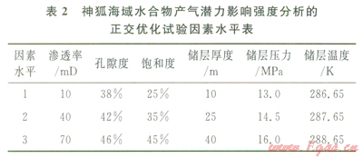 水合物藏產(chǎn)氣潛力的地質(zhì)評(píng)價(jià)參數(shù)是指對(duì)水合物產(chǎn)氣效率產(chǎn)生影響的沉積地質(zhì)要素,地質(zhì)評(píng)價(jià)參數(shù)的正確選擇是產(chǎn)氣潛力評(píng)價(jià)的關(guān)鍵。首先,通過綜合特定海域水合物區(qū)的地質(zhì)、地球物理、鉆探數(shù)據(jù)等資料,研究巖性、巖相展布規(guī)律、水合物的賦存狀態(tài)和地質(zhì)條件、水合物產(chǎn)m特征和儲(chǔ)層類型,定性和定量分析影響水合物分解和產(chǎn)氣潛力的各項(xiàng)要素,如巖性、溫壓條件、沉積體孔隙度、水合物飽和度、滲透率、儲(chǔ)層厚度、孔隙水鹽度等;然后,數(shù)值分析地質(zhì)參數(shù)對(duì)水合物產(chǎn)能的影響強(qiáng)度和敏感性,利用正交優(yōu)化試驗(yàn)方法對(duì)地質(zhì)參數(shù)的影響強(qiáng)度進(jìn)行排序,如表l中南海北部神狐海域3個(gè)站位上的水合物產(chǎn)出特征的地質(zhì)參數(shù),可構(gòu)建如表2所示的正交優(yōu)化試驗(yàn)因素水平表,通過選用合適的正交表即可實(shí)現(xiàn)對(duì)地質(zhì)參數(shù)的優(yōu)化和排序;選擇對(duì)水合物藏產(chǎn)氣潛力影響較為顯著的地質(zhì)參數(shù),舍棄影響較小、敏感性差的地質(zhì)參數(shù)。