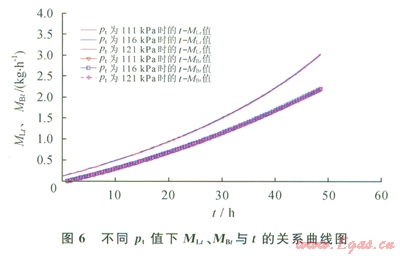 圖6為當(dāng)環(huán)境溫度為293K、儲(chǔ)罐冷卻初始溫度為273K、冷卻速度為-3.5K/h,儲(chǔ)罐壓力分別為111kPa、116kPa和121kPa時(shí),進(jìn)入儲(chǔ)罐LNG流量和排出儲(chǔ)罐BOG流量隨時(shí)間的變化趨勢(shì)。由圖6可知,儲(chǔ)罐壓力的變化對(duì)進(jìn)入儲(chǔ)罐的LNG需求量和BOG排放量影響很小。