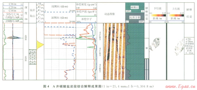 摘 要:為了有效地對碳酸鹽巖儲層進(jìn)行測井評價,針對其非均質(zhì)性強、各向異性大、裂縫發(fā)育、測井解釋難度大的特點,中國石油渤海鉆探工程公司測井公司研發(fā)了基于遠(yuǎn)探測聲波反射波的成像測井技術(shù)。該技術(shù)借鑒了物探的采集技術(shù),用測井的方法實現(xiàn)了對反射波的測量。在筒述遠(yuǎn)探測聲波反射波成像測井基本原理、儀器特點及采集基本信息的基礎(chǔ)上,用參數(shù)估計法對所采集的基本信息進(jìn)行分析,能有效地分離反射波和模式波,壓制噪音,并進(jìn)一步把反射波分離為上、下行反射波;還設(shè)計了典型的地質(zhì)體的模擬實驗,確定了不同地質(zhì)體的上、下行反射波的響應(yīng)特征,從而達(dá)到以實驗響應(yīng)特征為依據(jù)對實際測井資料進(jìn)行解釋的目的,可發(fā)現(xiàn)常規(guī)測井探測不到的儲集層。在塔里木盆地碳酸鹽巖儲層的實際應(yīng)用效果表明,該技術(shù)彌補了以往測井探測深度不足的缺陷,探測深度由原來的3m提升到10m,可以為試油決策提供科學(xué)依據(jù),從而避免因常規(guī)測井探測深度不足而漏失油氣層。