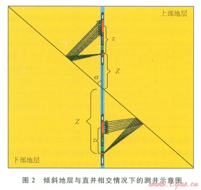 圖2顯示了傾斜地層與直井相交情況下的測井。由傾斜地層產(chǎn)生的反射波按照傳播方向可分為上行反射波和下行反射波。設(shè)地層與井的夾角是a,反射波旅行時表達(dá)式為: