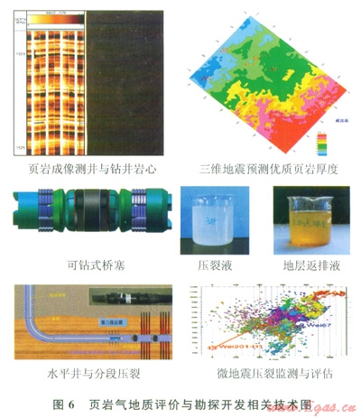 在頁巖氣勘探開發(fā)前,中國已在沁水盆地、鄂爾多斯盆地、四川盆地成功實現(xiàn)了煤層氣和致密砂巖氣的規(guī)?;I(yè)生產,基本明確了非常規(guī)天然氣的地質特征、富集規(guī)律,基本形成了一套有效的地質評價、富集區(qū)選擇方法,初步摸索出了一套有效的勘探開發(fā)技術。在頁巖氣勘探開發(fā)進程中,中國充分借鑒、學習北美的成熟技術[10],充分利用中國在常規(guī)及其他非常規(guī)油氣勘探開發(fā)中形成的先進有效技術,在致力于頁巖氣地質理論研究的同時,初步探索形成了多項頁巖氣勘探開發(fā)適用技術(圖6),包括頁巖氣形成與富集特征研究方法、頁巖氣地質評價與選區(qū)方法、頁巖氣資源評價方法、頁巖氣測井識別與處理解釋技術、地震采集處理與儲層識別預測技術、水平井鉆完井技術、水平井分段體積壓裂工藝技術、頁巖儲層改造配套工具、儲層改造低摩阻與速溶滑溜水體系、多種裂縫監(jiān)測診斷評估技術等。