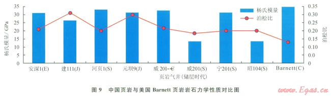 在地質特征上,作為有勘探開發(fā)遠景的含氣頁巖儲層既要有產氣潛力大的物質基礎——高質量儲層(RQ),也要是能進行有效壓裂的目標——良好的鉆完井地層(CQ)。有機質含量高的富含有機質頁巖是在特殊條件下形成的[2],這種特殊的條件使得所有頁巖氣儲層都有其獨特性(圖7) [6-7],即便是同一套頁巖儲層的地質特征在縱橫向上也往往會有非常明顯的變化。每一頁巖儲層要實現(xiàn)工業(yè)化規(guī)模開發(fā)都需要花費一定的時間對其地質特征進行認識,摸索適應的工程技術。從對比研究的結果可知,與北美地臺頁巖氣儲層相比,中國頁巖氣形成與富集地質條件非常復雜,除頁巖沉積總面積可能相當外,其他條件都相差較遠。美國產氣頁巖主要是海相沉積,而中國除海相頁巖外,還有較為發(fā)育的海陸過渡相和陸相頁巖(圖8)。美國頁巖氣主要產白上古生界一中生界,中國白元古界到新近系都有頁巖發(fā)育[1]。美國頁巖熱(R。)為1.0%~3.5%,處在生氣高峰期,中國海相頁巖R。為2.3%~5.1%,為高——過成熟熱裂解成氣階段,陸相頁巖R。為0.4%~l.2%,處于低熟一成熟階段,以生油為主,局部生氣。北美地臺構造穩(wěn)定,斷裂少,頁巖自沉積、成巖、成氣以來,除有一定抬升外,很少有大的構造改造,中國構造背景總體處在活動性較強的區(qū)域,斷裂發(fā)育,大部分頁巖都經歷了強烈的后期多次改造,南方海相頁巖大面積出露。另外,從圖9中可明顯看出,中國頁巖儲層楊氏模量較低、泊松比高,巖石脆性指數(shù)低于美國頁巖儲層,可壓性差。