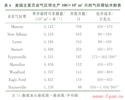 頁巖氣井生產具有單井產量低、遞減快等顯著特征,需要大量鉆井才能實現(xiàn)頁巖氣規(guī)模產量與穩(wěn)產(表4)。因此,頁巖氣勘探開發(fā)投資巨大,成本高,一般企業(yè)承擔不了如此巨大的投入風險。美國的頁巖氣勘探開發(fā)是在較為完善的天然氣管網和發(fā)育的消費市場基礎上,不斷改善技術、優(yōu)化作業(yè)流程、降低成本,才使其勘探開發(fā)成本明顯偏高,短期內根本無利可圖。四川盆地頁巖氣勘探開發(fā)試驗區(qū)統(tǒng)計結果表明,目前該試驗區(qū)頁巖氣水平井所需費用均超過4000萬元(人民幣),有的甚至達到7000萬元(人民幣),單井頁巖氣產量僅1.0×104~15.0×104m3/a,單井可采儲量為0.2×108~0.5×108m3,其虧損明顯。況且中國頁巖的賦存地質條件比美國復雜,頁巖氣勘探開發(fā)成本本身就可能會高于美國。