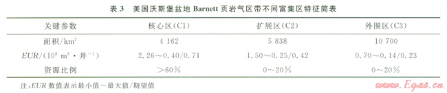 更為重要的是每一個成功的頁巖氣田從發(fā)現(xiàn)到工業(yè)化規(guī)模開發(fā)都需要經歷“點上發(fā)現(xiàn)、面上評價、落實核心區(qū)、拓展規(guī)模開發(fā)”4個階段。與常規(guī)油氣資源勘探開發(fā)不同,頁巖氣首先是在遠景區(qū)帶評選的基礎上,通過l~2口或更多一點的鉆井工作,驗證貞巖氣的存在,實現(xiàn)點上發(fā)現(xiàn);再以數(shù)口至數(shù)10口評價井鉆探,對整個頁巖氣區(qū)帶開展面上評價,落實資源規(guī)模,分析資源分布規(guī)律,劃分不同資源豐度富集區(qū);隨后進行富集區(qū)綜合評價,開展先導試驗井鉆探,評價單井產能,總結高產富集規(guī)律,確定核心區(qū);最后以核心區(qū)為重點,實現(xiàn)工業(yè)化規(guī)模開發(fā),以此為基礎逐漸拓展,最終實現(xiàn)頁巖氣區(qū)帶整體開發(fā)。頁巖氣形成與富集機理特殊,一般大面積連續(xù)分布,資源富集程度總體較低,核心區(qū)為資源相對富集區(qū)。一個頁巖氣區(qū)帶中,核心區(qū)范圍不大,但所擁有的資源可占整個頁巖氣區(qū)帶的60%以上[6-7](表3),單井最終可采儲量(EUR)高,核心區(qū)內的頁巖氣井中的干井、低產井比例不足4%。因此,核心區(qū)的確定成為一個頁巖氣區(qū)帶成功的關鍵。中國頁巖氣勘探開發(fā)處于起步階段,資源潛力尚未完全落實,遠景頁巖氣區(qū)帶尚未確定,核心區(qū)的確定目前更無從談起。