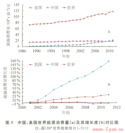 中國社會經濟持續(xù)高速發(fā)展,能源需求量屢創(chuàng)新高。2011年中國一次能源生產總量為2 446.1×106t油當量,一次能源消費量為2613.2×106t油當量[3]。2000—2011年世界平均能源消費量增長為31.2%,而中國能源消費量則增長了158.6%,占世界總能源消費增長量的21.3%,超過了美國等發(fā)達國家(圖3)。但中國能源資源量仍非常低,尤其是人均油氣資源量僅占世界平均水平的6%。中國1993年首次成為石油凈進口國,2006年天然氣也跨人凈進口國之列[5]。中國石油對外依存度由l993年的l.2%飆升到2011年的58%,天然氣對外依存度由2006年的0.8%迅速攀升至2011年的23%,成為全球能源市場中最重要的進口國。在天然氣需求中,近年來(2006 2011年)盡管中國的天然氣產量每年平均增長l3%以上,成為全球天然氣產量增長最快的國家之一,但總量還是非常少的。2011年中國天然氣產量為1025×108m3,天然氣消費量同期年均增長量超過18%,2011年中國天然氣消費量達1307×108m3。據(jù)預測,到2020年中國天然氣年均消費量仍將以19%的復合年增長率遞增,在中國能源結構中的比例將由2011年的5%提高到l0%~l 5%,而屆時中國天然氣產量僅為2000×108m3左右。