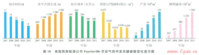 頁巖氣本身是潔凈能源,毋庸置疑,但頁巖氣在勘探開發(fā)巾會引發(fā)嚴重的環(huán)境污染問題也不應回避。美國有輿論指出頁巖氣開采已產生了明顯的環(huán)境污染,在美國的一些地方,已爆發(fā)多起抗議由頁巖氣勘探開發(fā)導致的水源污染、房屋損害等事件。歐洲因擔心頁巖氣勘探開發(fā)存在環(huán)境隱患而叫停了多個頁巖氣項目,越來越多的國家正在由于對環(huán)境的擔憂而不鼓勵頁巖氣發(fā)展[13]。頁巖氣勘探開發(fā)可能造成的環(huán)境污染包括勘探開發(fā)中大量占有土地對地表的破壞、大量鉆井液與壓裂液的用水與排放對水資源的過度使用與污染(表5)、烴類氣體遺散及其他有害物質的排放對大氣及土地等的污染。大量占有土地、鉆井液與壓裂成功實現(xiàn)了頁巖氣大規(guī)模商業(yè)性開采。據(jù)美國西南能源公司2007—2011年對Fayetteville頁巖氣區(qū)帶的開發(fā)統(tǒng)計,通過不斷的技術進步和優(yōu)化作業(yè)流程,鉆井時間減少了52%以上,水平井段長度增加了84%以上,產量、儲量均提高了7倍以上,但鉆井成本基本保持不變,發(fā)現(xiàn)和開發(fā)成本大幅度降低(圖10) [2],盡管如此,該區(qū)帶所有頁巖氣井,仍有80%處于虧損或無利可盈狀態(tài),只有20%的井有盈利狀態(tài)。中國頁巖氣勘探開發(fā)剛駛人工業(yè)化試驗發(fā)展道路,以地質評價、資源落實、技術積累為主,頁巖氣鉆井、儲層改造技術還不成熟,工具、工藝不配套,特別是施工工具、裂縫監(jiān)測等工具與技術尚需進口,同時,盡管中國的天然氣市場需求旺盛,但管網建設還不成熟且分布不均,使中國頁巖氣液的用水在中國將是更為嚴峻的環(huán)保挑戰(zhàn)。在中國南方地少人多、地貌以丘陵、山地為主,頁巖氣井場往往會臨近村舍,人口密集,且取水、排液主要以灌溉及飲用水源為主,這將使得頁巖氣在鉆井、儲層改造中面臨嚴峻的噪音消除、鉆井液與壓裂液處理及交通設施協(xié)調的壓力。大量土地占有,會造成地表植被破壞,大規(guī)模水力壓裂會破壞巖層穩(wěn)定性,二者并存將會增加山體滑坡發(fā)生的町能性。在中國北方,尤其是兩北地區(qū),干旱缺水現(xiàn)象較為突出,在較短的時間內消耗大量的水,會給當?shù)厝诵笥盟凸I(yè)用水帶來影響。另外,水力壓裂中大量消耗和陶粒、石英砂及KC1等也是寶貴的天然資源。