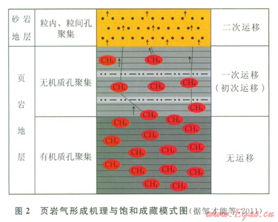 烴源巖排烴后烴類氣體(主要是甲烷)基本無運(yùn)移或頁巖層內(nèi)短距離運(yùn)移,屬于“自生自儲(chǔ)”,而常規(guī)天然氣要經(jīng)過二次運(yùn)移,從生氣層運(yùn)移到儲(chǔ)氣層(圈閉)中聚集成藏(圖2)。