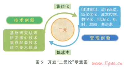 “二元論”是從我國(guó)鄂爾多斯盆地非常規(guī)油氣勘探開發(fā)實(shí)踐中總結(jié)形成的成功做法,是指在頁巖氣開發(fā)建設(shè)和技術(shù)攻關(guān)中,技術(shù)創(chuàng)新與管理創(chuàng)新相互結(jié)合,集中配置人力、物力、投資、組織等要素,通過集成與集約,以較低的成本實(shí)現(xiàn)開發(fā)目標(biāo)(圖5)。