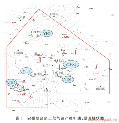 結(jié)合傳統(tǒng)與室內(nèi)實(shí)驗(yàn)判斷結(jié)果綜合分析安岳地區(qū)須二段氣藏為飽和凝析氣藏,由于儲(chǔ)層的非均質(zhì)性導(dǎo)致了局部有少量原油存在,即使個(gè)別井口可能會(huì)出現(xiàn)開井初期產(chǎn)出大量原油的現(xiàn)象,但是隨著生產(chǎn)的進(jìn)行,原油產(chǎn)出量也會(huì)迅速下降,由此,將安岳地區(qū)須二段氣藏類型確定為帶“油墊”的飽和凝析氣藏。從成藏的角度看,可能由于致密強(qiáng)非均質(zhì)氣藏中原油的差異聚集或原油的裂解,致使局部存在少量原油。