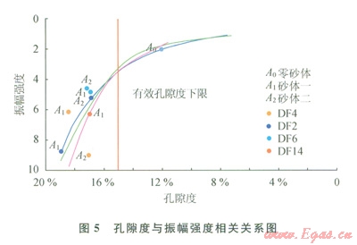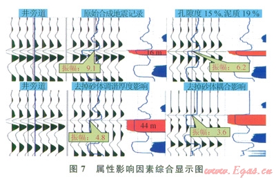 研究結(jié)果顯示(圖5),泥質(zhì)含量增加后,總孔隙度隨之降低,巖石速度及密度也應(yīng)該隨之增加。即當(dāng)儲層物性變差,儲層反射強(qiáng)度降低。如圖5所示,多口井測井曲線擬合趨勢基本相同。將各井實(shí)鉆儲層頂面振幅其他因素的影響剔除后,實(shí)鉆振幅值與正演模擬趨勢基本吻合。證明該規(guī)律可以代表真實(shí)物性變化條件下的地震反射變化情況。同時(shí),該研究結(jié)果可以將地震振幅大小與物性下限(15%)相對應(yīng),當(dāng)不受調(diào)諧及其他因素影響的時(shí)候,真實(shí)氣層頂面反射振幅在3.5左右。所以對振幅強(qiáng)度低于3.5的區(qū)域在儲量計(jì)算時(shí)基于風(fēng)險(xiǎn)考慮,儲量級別相應(yīng)降低。