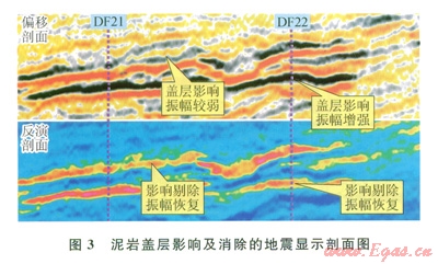 DFl3氣田平面分布達(dá)數(shù)百平方千米,儲層、蓋層橫向上變化較大。受沉積速度、厚度及壓實(shí)不均影響,泥巖蓋層的速度及密度在空間上存在較大差異。由此導(dǎo)致同一套氣層具有完全不同的地震響應(yīng)特征。當(dāng)存在致密泥巖蓋層時(shí),致密泥巖旁瓣的波谷會與氣層頂面的波谷疊加,導(dǎo)致氣層頂面出現(xiàn)異常“亮點(diǎn)”;相反,當(dāng)蓋層是一套相對低阻抗泥巖時(shí)(本區(qū)蓋層阻抗均高于儲層),氣層頂面反射相應(yīng)減弱,從而導(dǎo)致對儲層含氣性的誤判。