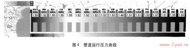 管道核心工藝圖的主要表現(xiàn)形式是按照廠站分布和管道走向,將廠站工藝和管道走向相結(jié)合。從該圖上,可以看到單條高壓管道的完整平面工藝,包括廠站內(nèi)的工藝,同時可以看到整條管道運行壓力曲線(見圖4)、廠站工藝運行狀態(tài)顯示。