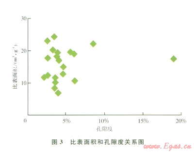 頁(yè)巖儲(chǔ)層為裂縫-孔隙結(jié)構(gòu),成巖作用過(guò)程中形成的裂縫和微孔是頁(yè)巖氣儲(chǔ)集空間和滲流通道。微孔對(duì)頁(yè)巖氣的儲(chǔ)存具有重要意義,一般而言,微孔體積越大,比表面積越大,對(duì)氣體吸附能力也就越強(qiáng)。國(guó)外測(cè)定的含氣頁(yè)巖巖心數(shù)據(jù)㈠表明,孔隙度與總氣體含量正相關(guān),受孔徑分布影響。圖2為國(guó)外實(shí)驗(yàn)室測(cè)定的頁(yè)巖孔隙度與含氣量關(guān)系。