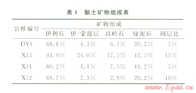表1為頁(yè)巖樣品黏土礦物相對(duì)含量分析結(jié)果。從分析結(jié)果可以看出,儲(chǔ)層黏土礦物類型和含量相差較大,主要以伊利石為主。頁(yè)巖礦物的相對(duì)含量和儲(chǔ)層膠結(jié)物含量變化將會(huì)影響頁(yè)巖的巖石力學(xué)性質(zhì)、孔隙結(jié)構(gòu)、氣體吸附能力等。石英含量影響頁(yè)巖的脆性,石英和碳酸鹽礦物含量越多,頁(yè)巖脆性越高,頁(yè)巖的孔隙越少,游離頁(yè)巖氣的儲(chǔ)集空間越少;方解石的膠結(jié)作用會(huì)導(dǎo)致儲(chǔ)層孔隙減少。黏土礦物表面積較大,微孔隙較多,當(dāng)水未飽和時(shí)對(duì)頁(yè)巖氣有較強(qiáng)的吸附能力。