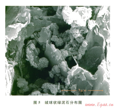 圖4、5是掃描電鏡觀測(cè)到的伊利石和綠泥石分布狀態(tài)。伊利石的吸附流體作用在TOC較低的頁(yè)巖中有很重要的影響。絨球狀綠泥石一般不具有膨脹性,只有在水鎂石八面體晶片酸蝕失玄了Mg2+、Fe3+的條件下才會(huì)導(dǎo)致水鎂石解體出現(xiàn)晶間膨脹。