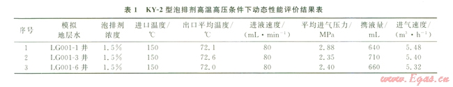 使用PP-1型高溫高壓泡沫評價裝置測定高溫高壓條件下KY-2泡排劑動態(tài)性能,其測試結果見表1。實驗數(shù)據(jù)表明在進口溫度