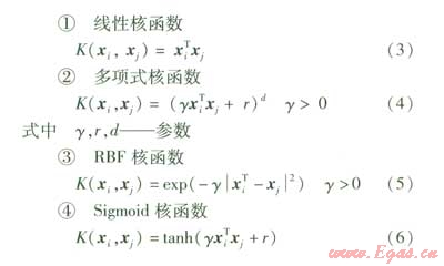 在SVM中最常用的幾種核函數(shù)見(jiàn)式(3)~(6),其中線性核函數(shù)可以看作是多項(xiàng)式核函數(shù)的一種特殊情況。