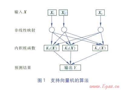 支持向量機(jī)(Support Vector Machine)簡(jiǎn)稱(chēng)SVM[8],是一種監(jiān)督式學(xué)習(xí)的方法,廣泛應(yīng)用于統(tǒng)計(jì)分類(lèi)以及回歸分析中,其算法見(jiàn)圖1。支持向量機(jī)首先通過(guò)內(nèi)積核函數(shù)K(X)定義的非線性變換將輸入空間X變換到一個(gè)高維空間,然后在這個(gè)空間中求最優(yōu)分類(lèi)面,其輸出Y是中間節(jié)點(diǎn)的線性組合,每個(gè)中間節(jié)點(diǎn)對(duì)應(yīng)一個(gè)輸入樣本與一個(gè)支持向量的內(nèi)積,因此也被稱(chēng)為支持向量網(wǎng)絡(luò)。研究表明[9-10],相對(duì)于神經(jīng)網(wǎng)絡(luò)而言,支持向量回歸模型不存在局部極小值問(wèn)題,對(duì)于解決模糊、隨機(jī)、不確定性、樣本數(shù)有限和非線性的復(fù)雜問(wèn)題具有明顯優(yōu)勢(shì)。支持向量機(jī)從結(jié)構(gòu)風(fēng)險(xiǎn)最小化原則出發(fā),為機(jī)器學(xué)習(xí)提供了一個(gè)嶄新的方法,被認(rèn)為是小樣本學(xué)習(xí)中一種很好的機(jī)器學(xué)習(xí)算法。