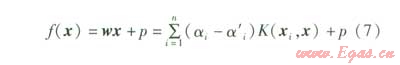 1996年國(guó)外相關(guān)學(xué)者提出了一種利用支持向量機(jī)進(jìn)行回歸的計(jì)算方法。該方法需要解決的問(wèn)題與式(1)類(lèi)似,通常被稱(chēng)為支持向量回歸(SVR)模型。假設(shè)待回歸的函數(shù)為f(x)=wx+P,樣本數(shù)據(jù)(xi,yi),i=1,…,n,xi∈Rn,yi∈R,按照支持向量機(jī)理論,其擬合函數(shù)為: