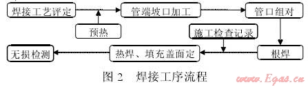 常用焊接方法有:手工電弧焊、埋弧自動焊、氬弧焊、CO2氣體保護焊、等離子弧焊、電渣焊。高壓、次高壓管道主要采用的焊接方法:焊條電弧焊上向焊(手工焊)、焊條電弧焊下向焊(手工焊)、自動保護藥芯焊絲電弧焊下向焊(半自動焊)、熔化極氣體保護電弧焊下向焊(半自動焊、機械化焊接),其焊接工序流程見圖2: