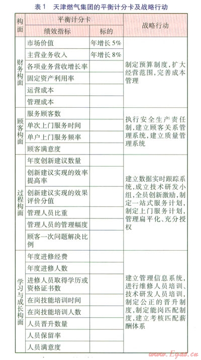 KaplanNorton認(rèn)為,組織在建立了高瞻遠(yuǎn)矚的愿景,確定了已達(dá)成共識的戰(zhàn)略主題后,如果沒有相應(yīng)的績效指標(biāo)來衡量戰(zhàn)略實(shí)施的效果,那么戰(zhàn)略往往會(huì)成為一紙空談。因此,在戰(zhàn)略地圖中展示的戰(zhàn)略性衡量項(xiàng)目需要用一些績效指標(biāo)來衡量,才能更好地對戰(zhàn)略加以實(shí)施。天津燃?xì)饧瘓F(tuán)的平衡計(jì)分卡及戰(zhàn)略行動(dòng)見表l,由于績效指標(biāo)的標(biāo)的會(huì)隨具體情況而調(diào)整,因此僅舉例說明。表l展示了4個(gè)構(gòu)面,從戰(zhàn)略主題轉(zhuǎn)化為可操作的戰(zhàn)略行動(dòng),再依靠績效指標(biāo)衡量戰(zhàn)略行動(dòng)是否能夠達(dá)成,戰(zhàn)略主題是否實(shí)現(xiàn),從而最終形成從愿景到戰(zhàn)略行動(dòng)的完整計(jì)劃。