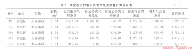 通過統(tǒng)計(jì)出的每口井含氣頁(yè)巖層段的厚度,可以繪制出含氣頁(yè)巖層段厚度等值線圖,同時(shí)結(jié)合地震資料追蹤有效層段,控制平面上等值線的走勢(shì)。根據(jù)研究區(qū)塊大安寨段巖石物性分析測(cè)試數(shù)據(jù),大安寨段頁(yè)巖密度平均為2.61 g/cm3。根據(jù)實(shí)例井大安寨段實(shí)測(cè)TOC資料及現(xiàn)有的測(cè)井資料進(jìn)行了多元統(tǒng)計(jì)分析擬合,計(jì)算出吸附氣量,繪制TOC等值線圖及吸附氣量等值線圖,計(jì)算出吸附氣資源量;根據(jù)實(shí)測(cè)孔隙度資料、現(xiàn)有的測(cè)井?dāng)?shù)據(jù)分別分析擬合、計(jì)算孔隙度,進(jìn)而計(jì)算含水(氣)飽和度和游離氣百分含量,最終得到游離氣資源量;最后計(jì)算m該研究區(qū)不同概率的總資源量(表3)。