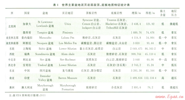 筆者通過文獻(xiàn)調(diào)研[5],對(duì)全球主要盆地含氣泥頁(yè)巖層段(系統(tǒng))頂、底板的地質(zhì)特征進(jìn)行了統(tǒng)計(jì)。結(jié)果顯示(表1),世界范圍內(nèi)主要盆地頁(yè)巖地層頂、底板巖性以致密的泥頁(yè)巖、膏泥巖、膏鹽層、石灰?guī)r、白云巖、火山巖、煤層等為主,屬于非滲透或低滲透巖層。其埋深范圍從l