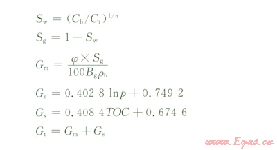 式中Sw、Sg分別為氣測地層含水率和含氣飽和度;以為氣測含烴飽和度指數(shù),一般為3~7;Cb、Ct分別為烴背景值和儲層異常值;Bg為天然氣體積系數(shù);TOC為總有機碳含量;Gm、Gs、Gt分別為頁巖氣儲層游離氣量、吸附氣量和總含氣量,m3/t。