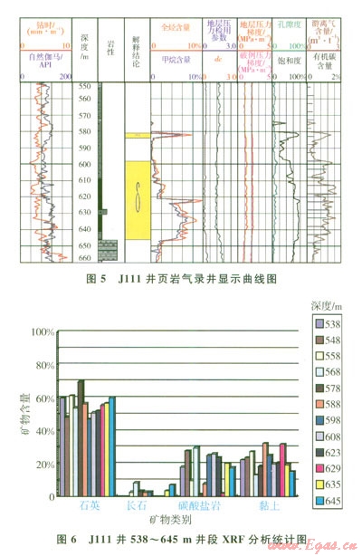 頁巖氣層隨鉆錄井解釋評價參數(shù)確定方法在川東、鄂兩地區(qū)J111、JYHF-1、HY-1、FYHF-1井進行了應(yīng)用試驗,獲得了比較好的應(yīng)用效果。這里重點介紹中國石油化工股份有限公司首口頁巖氣勘探試驗井——J111井的應(yīng)用情況。