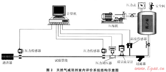 由于目前國(guó)內(nèi)天然氣減阻劑的研究尚處于實(shí)驗(yàn)階段,還沒(méi)有建立起天然氣減阻劑減阻性能評(píng)價(jià)標(biāo)準(zhǔn)。參照現(xiàn)有“原油減阻劑減阻性能評(píng)價(jià)系統(tǒng)”,與中國(guó)石油管道科技研究中心合作設(shè)計(jì)制作了國(guó)內(nèi)首個(gè)天然氣減阻劑室內(nèi)評(píng)價(jià)系統(tǒng),其結(jié)構(gòu)示意圖如圖2所示[6]。