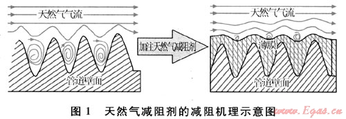 天然氣減阻劑的減阻機(jī)理是將稱作“天然氣減阻劑”的化學(xué)品注入天然氣管道中,通過(guò)天然氣減阻劑分子中的極性基團(tuán)對(duì)鋼鐵表面的吸附,形成一層彈性分子薄膜。這種具有彈性的吸附薄膜緊緊吸附在管壁內(nèi)表面,使得管壁表面的凹陷、溝槽被填塞,實(shí)際上又形成了一層新的彈性壁面。天然氣氣流在輸送過(guò)程中與新形成的較平滑的彈性薄膜壁面相接觸,不再與原有粗糙不平的金屬管道內(nèi)壁接觸,這樣天然氣氣流與管壁之間的摩擦減小,流動(dòng)阻力大大降低,從而達(dá)到輸氣管道減阻的目的嘲。天然氣減阻劑的減阻機(jī)理示意圖如圖1所示。