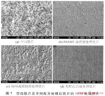 圖7分別為空白鐵片、PASMT成膜劑單獨(dú)處理鐵片、協(xié)同成膜助劑單獨(dú)處理鐵片、PASMT成膜劑和協(xié)同成膜助劑復(fù)配混合溶液處理鐵片的SEM電鏡照片。