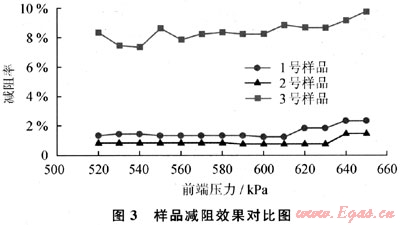 從圖3可以看出,在相同實(shí)驗(yàn)條件下,溶劑丙酮的用量為800mL,1號(hào)樣品僅含有5g PASMT成膜劑,其減阻率平均為1.5%;2號(hào)樣品僅含有100mL協(xié)同成膜助劑,其減阻率平均為0.9%;3號(hào)樣品為5g PASMT成膜劑與100mL協(xié)同成膜助劑復(fù)配的混合物,其減阻率平均為8.4%。復(fù)配后樣品的減阻率遠(yuǎn)遠(yuǎn)高于各組分單獨(dú)使用時(shí)的減阻率,表明PASMT成膜劑與協(xié)同成膜助劑產(chǎn)生了很大的協(xié)同減阻作用。