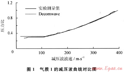 圖1為氣質(zhì)1減壓波波速計(jì)算結(jié)果與文獻(xiàn)實(shí)驗(yàn)數(shù)據(jù)的對(duì)比圖,初始?jí)毫?0.58MPa,溫度為-25.59℃。圖中“實(shí)驗(yàn)測(cè)量值”指本文參考文獻(xiàn)[6]中通過(guò)實(shí)驗(yàn)測(cè)得的數(shù)據(jù),“Decomwave”為開(kāi)發(fā)軟件計(jì)算的減壓波波速結(jié)果。