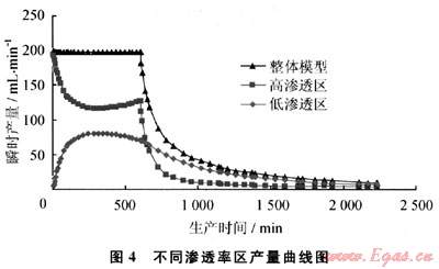 2) 開采初期,以高滲透區(qū)供氣為主,高滲透區(qū)產(chǎn)量遠(yuǎn)大于低滲透區(qū)產(chǎn)量;開采后期即穩(wěn)產(chǎn)期結(jié)束后,高滲透區(qū)產(chǎn)量遞減很快,而低滲透區(qū)產(chǎn)量遞減比較緩慢,且低滲透區(qū)產(chǎn)量貢獻(xiàn)率逐漸增大,即生產(chǎn)后期小產(chǎn)量生產(chǎn)時(shí)以低滲透區(qū)供氣為主(圖4)。低滲透區(qū)滲透率越高,則產(chǎn)量貢獻(xiàn)率越大。
