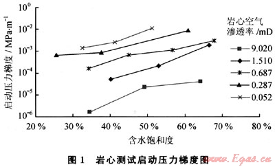 啟動(dòng)壓力梯度定義為作用在流體上的壓差達(dá)到一定程度時(shí),流體克服黏滯力開始流動(dòng)時(shí)的壓力梯度。在低滲透氣藏中,氣體滲流是否存在啟動(dòng)壓力梯度以及啟動(dòng)壓力梯度產(chǎn)生的條件一直是石油工作者研究和爭論的焦點(diǎn)之一。持肯定觀點(diǎn)的學(xué)者認(rèn)為天然氣在高溫高壓條件下與孔隙界面會(huì)產(chǎn)生一定的界面效應(yīng),或因?yàn)榭紫吨兴拇嬖诙率箽怏w滲流存在一定的啟動(dòng)壓力梯度。持否定觀點(diǎn)的研究人員認(rèn)為天然氣分子小,易于流動(dòng),在孔隙介質(zhì)中流動(dòng)不存在啟動(dòng)壓力梯度,如果說因?yàn)榭紫吨泻幸欢柡投鹊乃率箽怏w在某些條件下不流動(dòng),應(yīng)歸于兩相滲流的問題。筆者認(rèn)為:啟動(dòng)壓力梯度概念能較好的反映氣體流動(dòng)的動(dòng)態(tài)特征,綜合反應(yīng)了儲(chǔ)層物性、含水及驅(qū)動(dòng)壓力對(duì)氣體滲流的影響,在滲流方程中引入啟動(dòng)壓力梯度,能更好地描述低滲儲(chǔ)層的滲流特征,確定氣井的有效動(dòng)用范圍,為低滲氣藏開發(fā)井距的確定和井網(wǎng)優(yōu)化部署提供依據(jù)。根據(jù)實(shí)驗(yàn)分析,同一物性巖樣,含水飽和度越大,啟動(dòng)壓力梯度越大;巖石物性越差,啟動(dòng)壓力梯度越大,并且受含水飽和度影響更顯著(圖1)。